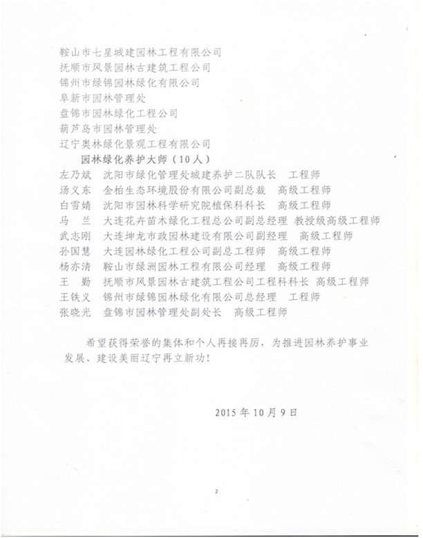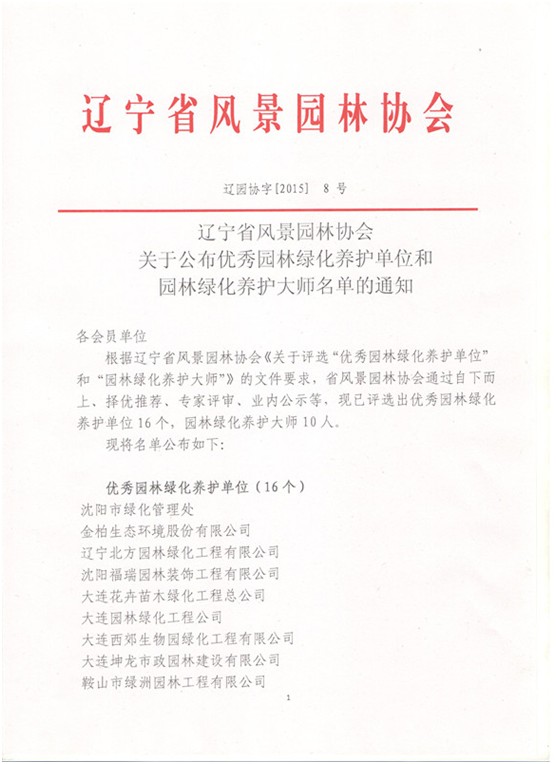 年度遼寧省風(fēng)景園林協(xié)會(huì)經(jīng)過(guò)嚴(yán)格評(píng)審,大連園林綠化工程公司被評(píng)為“優(yōu)秀園林綠化單位”榮譽(yù)稱號(hào),工程名稱(大連市體育中心配套工程綠化工程一標(biāo)段)。孫國(guó)慧被評(píng)為“園林養(yǎng)護(hù)大師”榮譽(yù)稱號(hào),先后參加養(yǎng)護(hù)工程有